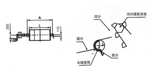 從河床提取的河沙加水后,進入格篩,篩去粗大石塊后,進入帶有勻礦板的槽體,再次經加水稀釋、漂洗的沙漿均勻的給到滾筒表面具有高磁力的選別區。其中較高品位的鐵沙被高磁力吸附于筒體表面,并被旋轉的筒體輸送到下部的洗沙區,經沖洗水沖掉附帶的沙后被輸送到礦區,由水流沖的鐵沙收集槽,成為高品位的鐵沙。而其中非槽性泥沙,則不受磁力作用直接進入尾槽排出。由此達到提取鐵粉的目的。
